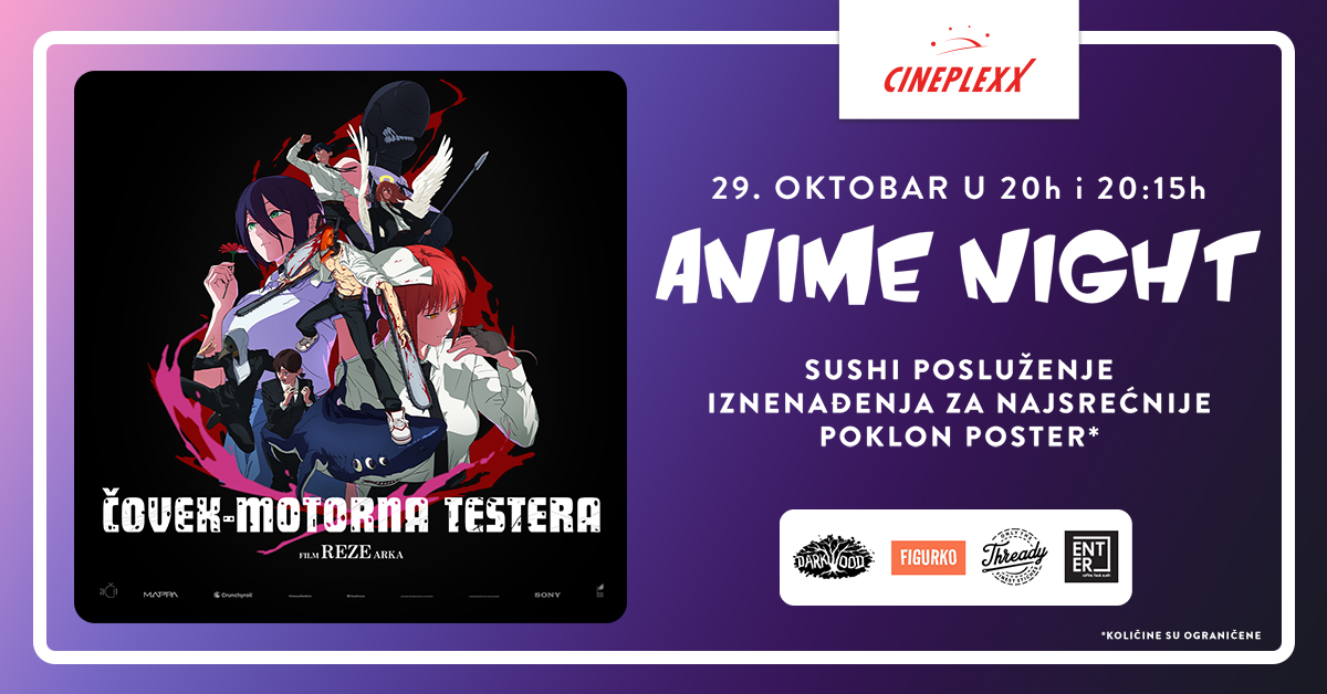 Популарни Anime night враћа се у биоскоп Синеплекс Нови Сад у среду, 29. октобра у 20 часова, када ће бити приказан филм „Chainsaw Man“ – експлозивна акциона авантура која наставља глобални аниме феномен и први пут стиже на велико платно.