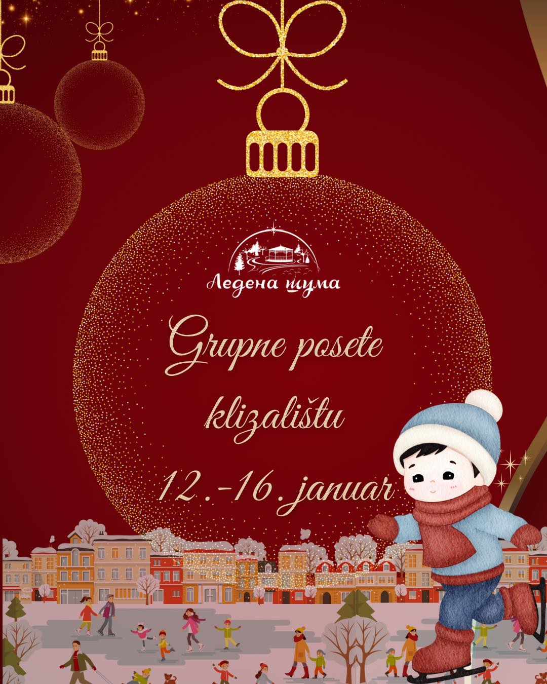 Деца предшколског узраста и ђаци основних и средњих школа могу долазити на клизање у пратњи својих васпитача, наставника, учитеља, тренера, разредних старешина и др. у СВИМ СМЕНАМА, током последње недеље трајања манифестације 12.-16. јануара, 2026.године уз најаву путем емаила: [email protected].