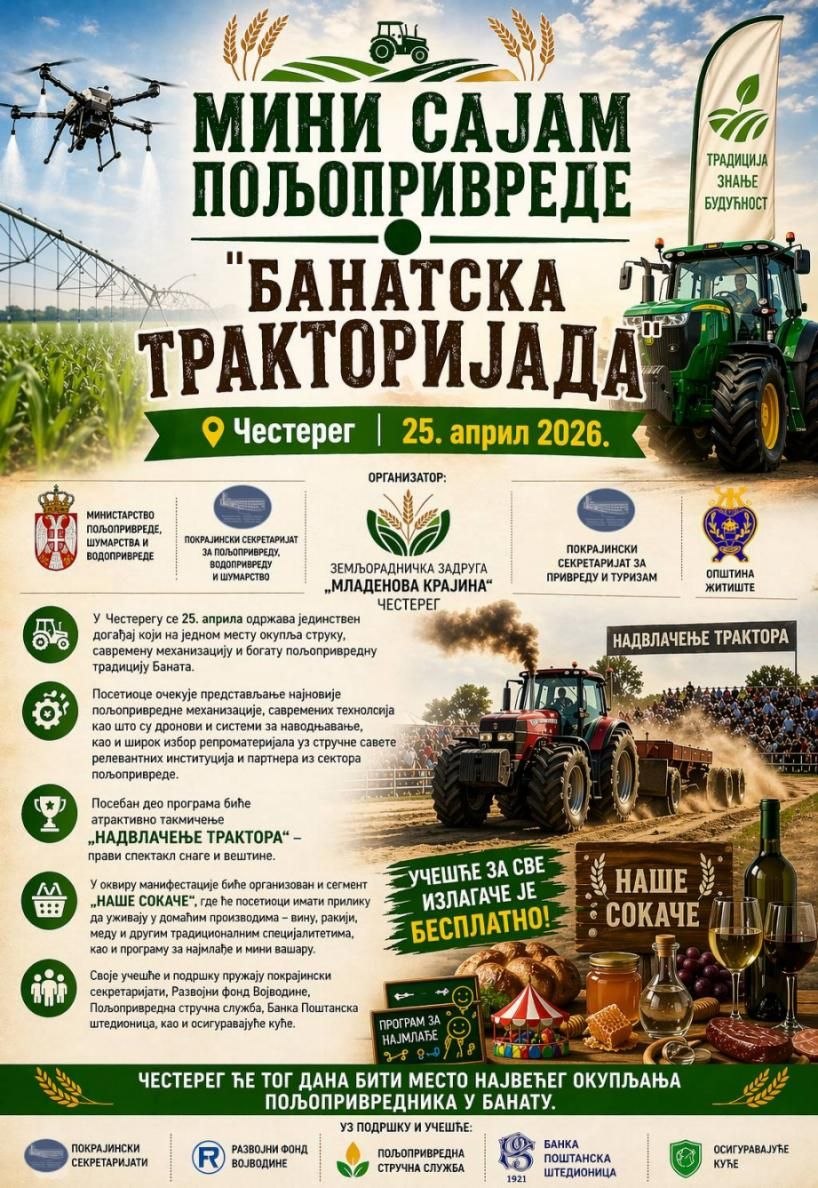 У Честерегу ће у суботу, 25. априла, бити одржан први мини сајам пољопривреде под називом „Банатска тракторијада“, који ће окупити пољопривреднике, стручњаке и љубитеље аграра из читавог региона.