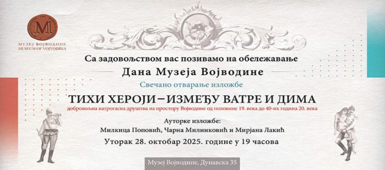 Музеј Војводине вас позива на обележавање Дана Музеја Војводине у уторак, 28. октобра у 19 сати (Дунавска 35). Овај свечани догађај биће обележен отварањем изложбе „Тихи хероји – између ватре и дима, добровољна ватрогасна друштва на простору Војводине од половине 19. века до 40-их година 20. века“, ауторки Чарне Милинковић, Милкице Поповић и Мирјане Лакић. … Настави са читањем Дан Музеја Војводине – отварање изложбе „Тихи хероји – између ватре и дима“