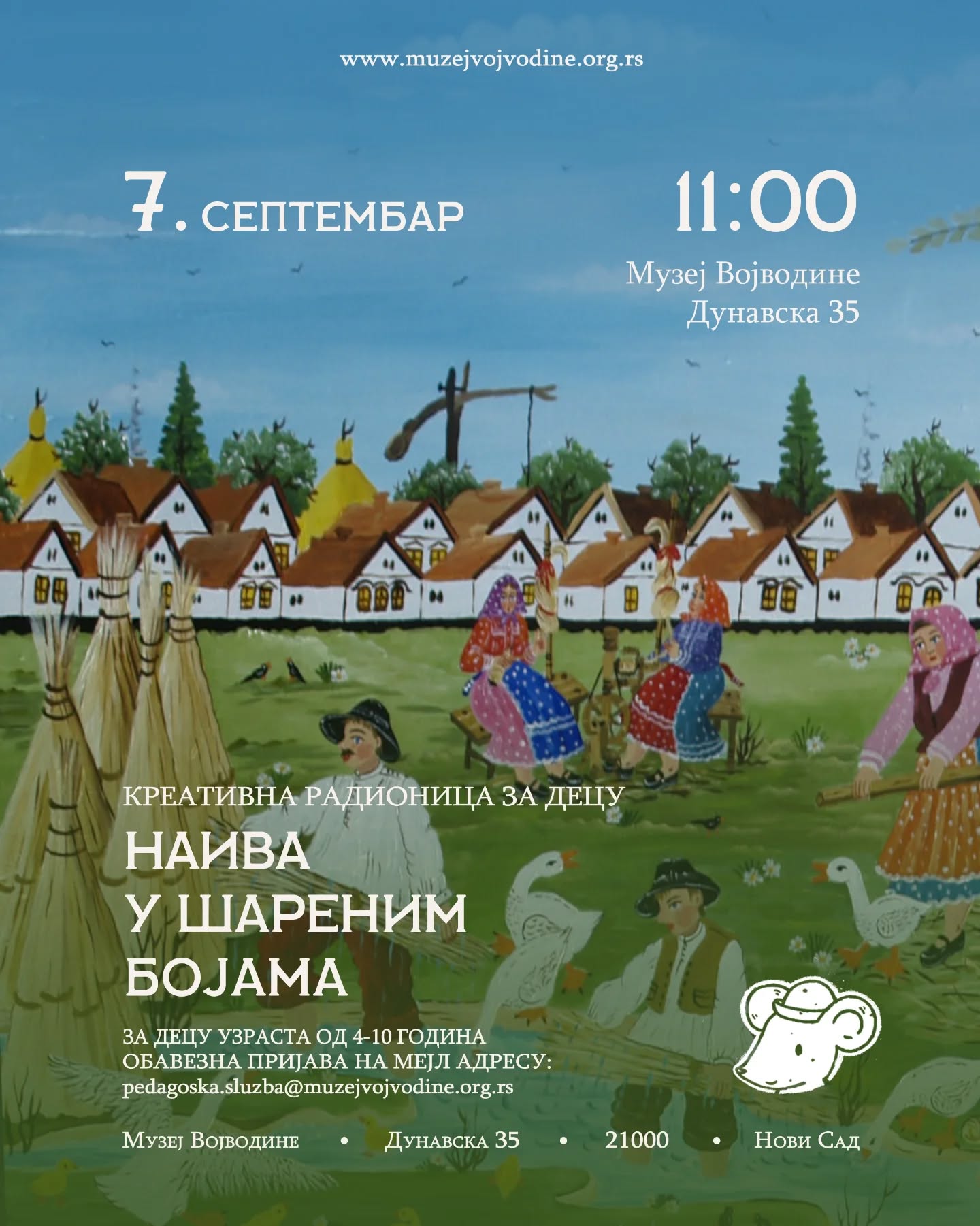 Дечија креативна радионица ,,Наива у шареним бојама” за децу узраста од 4 до 10 година одржаће се у недељу, 7. септембра у Музеју Војводине од 11:00 часова.