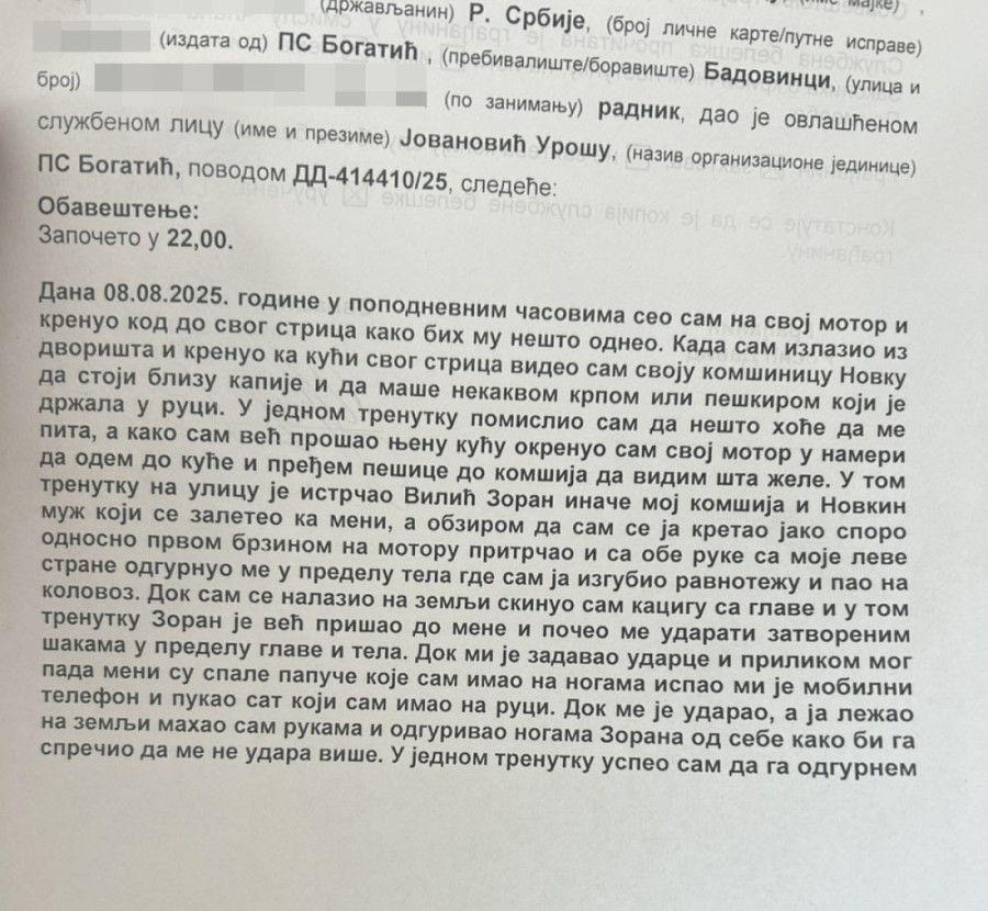 “Физички напад и покушај убиства су се догодили у петак око 19 сати. Припремио сам један мотор за фарбање и намеравао да га одвезем код стрица, да спремимо још неке ствари. При брзини од 20 километара на час, док је мотор био у покрету, комшија Вилић ме је гурнуо са мотора, покушавши да ме убије”, каже младић Д.Р. за 24седам.