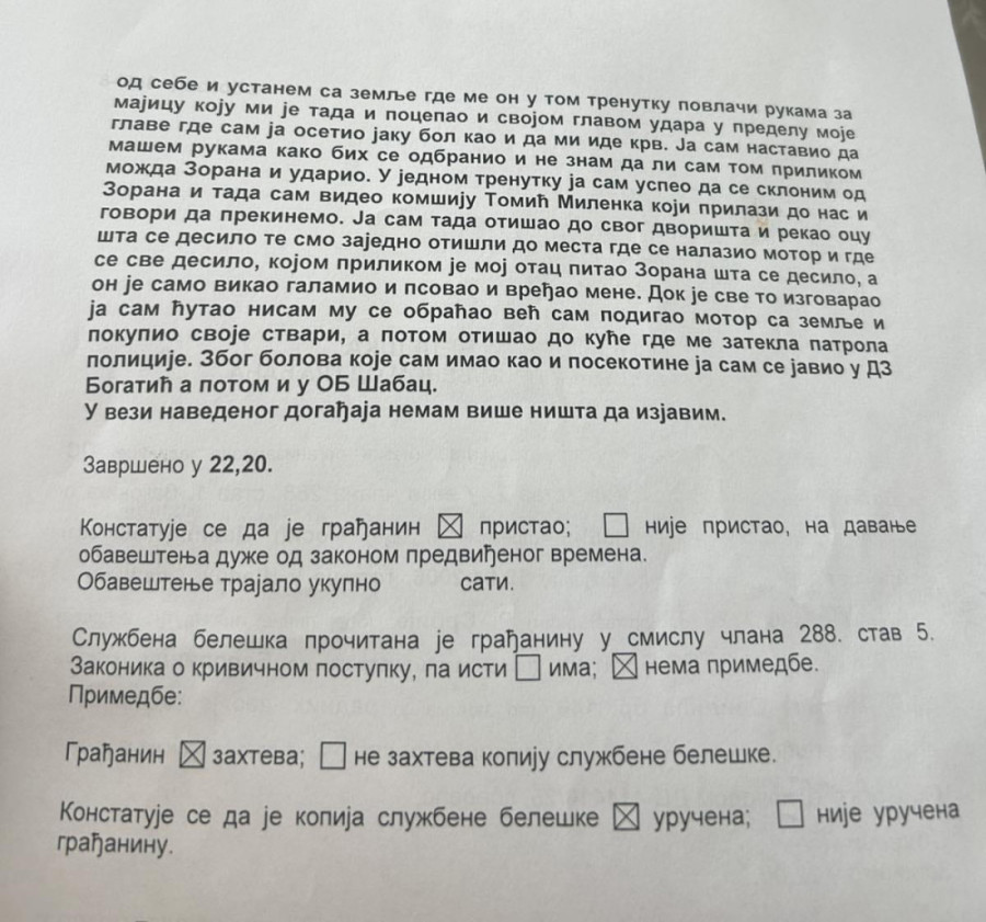 “Ја сам пао са мотора и када сам кренуо да устајем, ударио ме песницом, физички ме напао”, сведочи младић и прилаже записнике изјаве коју је дао у полицијској станици, као и лекарске извештаје.