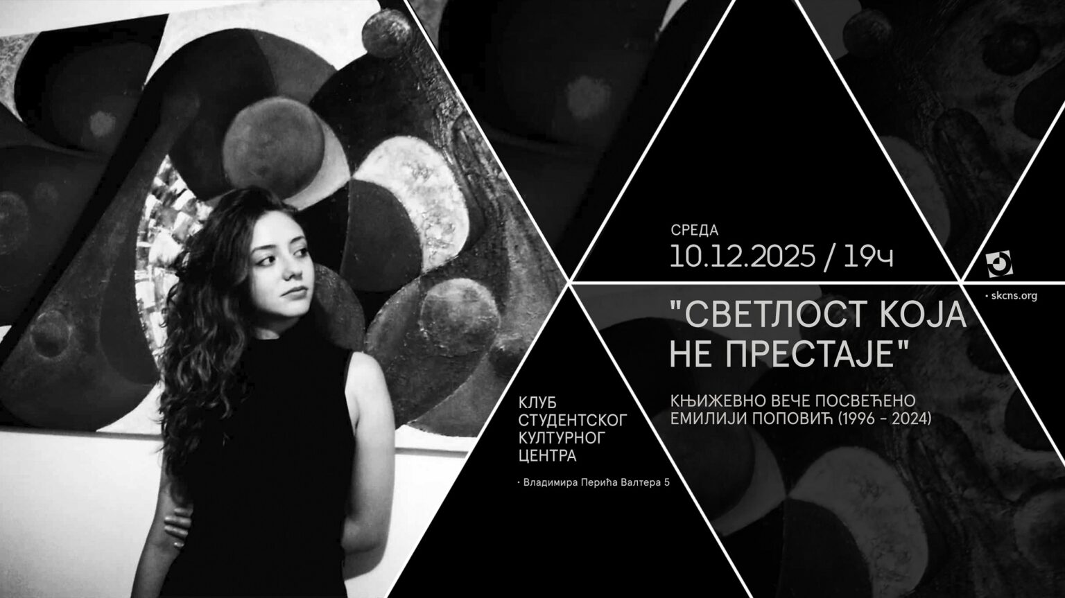 Књижевно вече посвећено Емилији Поповић – „Светлост која не престајеˮ, одржаће се у среду, 10. децембра у 19 часова у Студентском културном центру Нови Сад (Улица Владимира Перића Валтера 5).