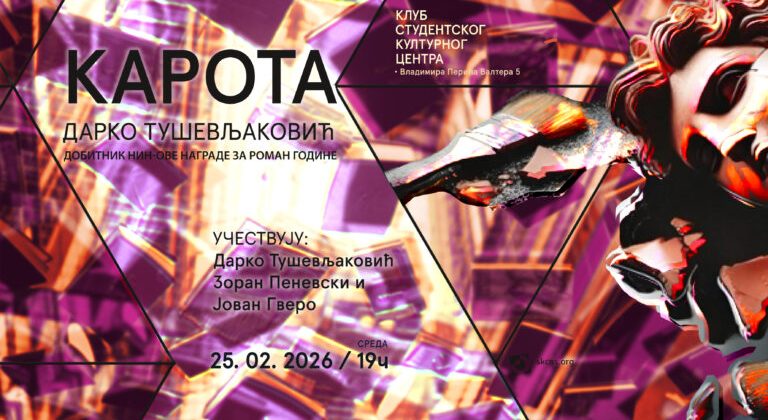 Промоција књиге „Карота” Дарка Тушевљаковића, добитника НИН-ове награде за роман године одржаће се у среду, 25. фебруара 2026. у 19 часова у Клубу Студентског културног центра Нови Сад (Владимира Перића Валтера 5). На промоцији ће, поред аутора, говорити Зоран Пеневски, писац и уредник овог романа, а разговор ће водити Јован Гверо из СКЦНС-а. Дарко Тушевљаковић … Настави са читањем НИН-ов лауреат Дарко Тушевљаковић представља роман „Карота“ у СКЦНС-у