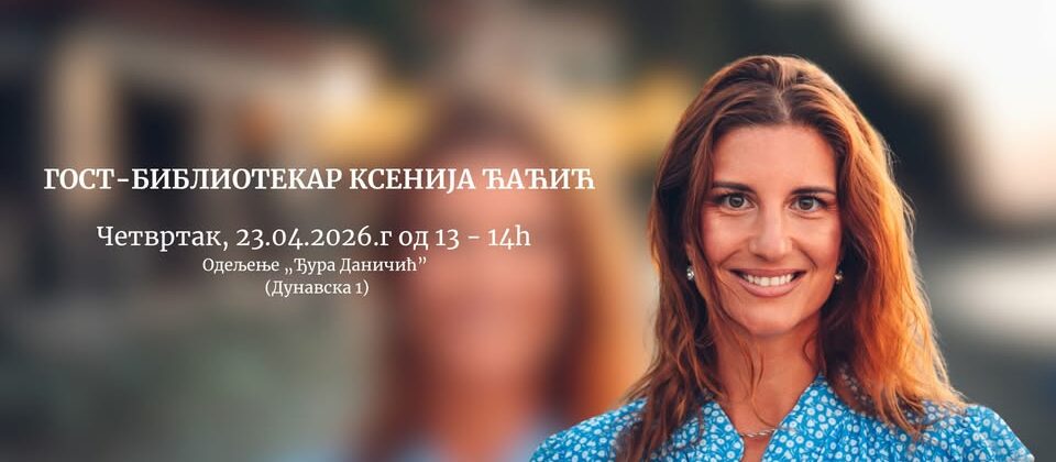 Поводом Светског дана књиге и ауторских права, на Одељењу „Ђура Даничић”, 23. априла, од 13.00 до 14.00 часова, гост-библиотекар биће књижевница Ксенија Ћаћић, која ће разговарати са корисницима Библиотеке и препоручивати књиге за читање. Градска библиотека се налази на адреси Дунавска 1. Награђивана, тражена кореографкиња Анабел Лопез Очоа почиње са радом у Српском народном позоришту … Настави са читањем Поводом Светског дана књиге и ауторских права у четвртак, 23. априла у Градској библиотеци гост-библиотекар биће књижевница Ксенија Ћаћић