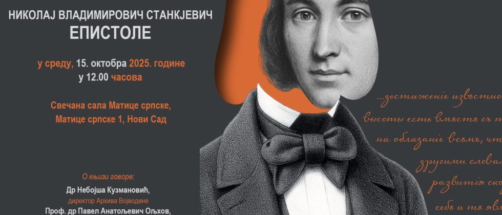 Архив Војводине и Матица српска са задовољством Вас позивају на представљање књиге „Николај Владимирович Станкјевич ЕПИСТОЛЕ“, у среду, 15. октобра 2025. године у 12 часова, Свечана сала Матице српске, (Матице српске 1, Нови Сад). О књизи ће говорити Др Небојша Кузмановић, директор Архива Војводине, Проф. др Павел Анатољевич Ољхов, филозоф и познавалац дела Станкјевича, Белгород, Русија, … Настави са читањем Представљање књиге „Николај Владимирович Станкјевич Епистоле“