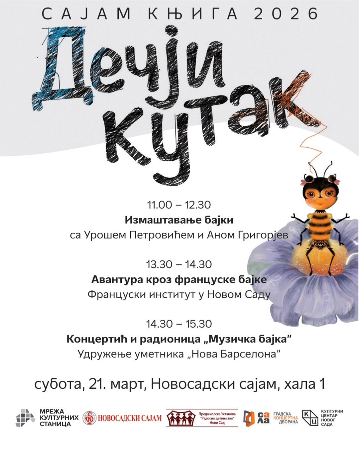 У оквиру Међународног сајма књига у Новом Саду, у суботу, 21. марта, Мрежа културних станица и Градска концертна дворана припремају разноврстан програм за најмлађе посетиоце, испуњен причама, музиком, маштом и позориштем.