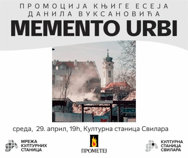 У среду, 29. априла у 19 часова, у Културној станици Свилара биће представљена књига есеја Данила Вуксановића “Memento urbi”, у издању Прометеја. Ово издање доноси јединствену, личну и уметнички обликовану причу о граду, његовим слојевима и сећањима која нестају пред нашим очима.