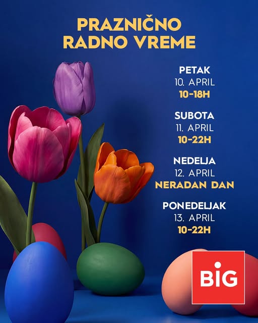 Петак, 10. / суботу, 11. и понедељак, 13. априла 2026. године објекат је отворен: трговачки и спортски простори раде према редовном распореду