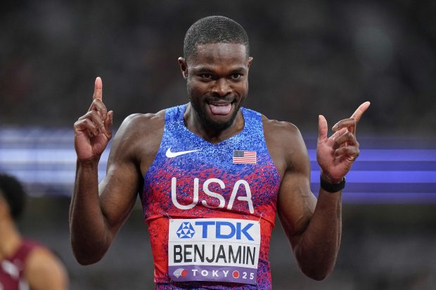 United States’ Rai Benjamin reacts after wining the gold medal in the men’s 400 meters hurdles final at the World Athletics Championships in Tokyo, Friday, Sept. 19, 2025. (AP Photo/Petr David Josek)