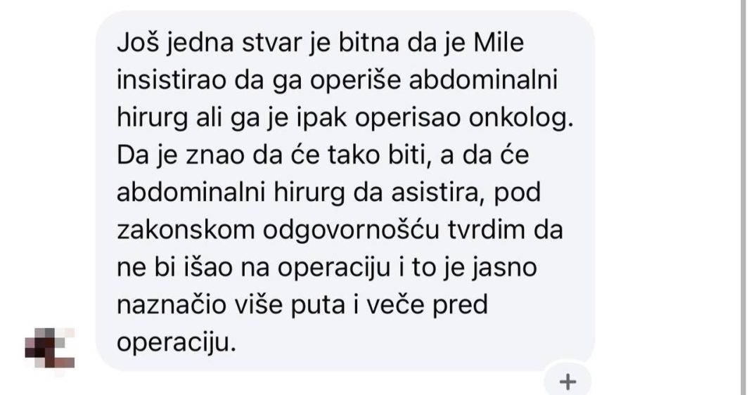 Према њеним речима, њен супруг је пре операције више пута наглашавао да жели да захват обави абдоминални хирург. Међутим, како наводи, на крају је операцију извео онколог, док је абдоминални хирург био присутан само као асистент.