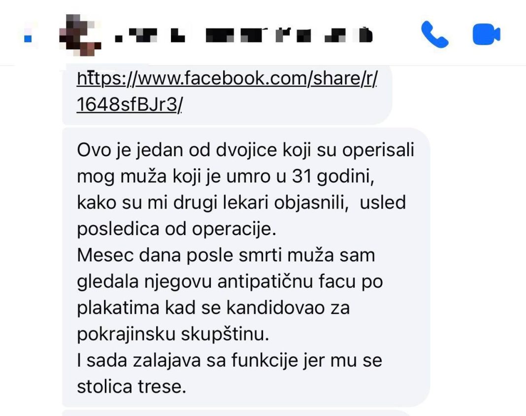 Она додаје да јој је посебно тешко пало то што је, како каже, само месец дана након смрти супруга виђала једног од лекара који су учествовали у операцији на предизборним плакатима током политичке кампање за покрајинску скупштину.
