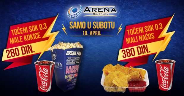 Биоскоп Аrena Cineplex припремио је и посебне меније за све посетиоце Супер суботе са сниженим ценама: мале кокице и точени сок 0.3 од 280 динара, док су мали наћоси и точени сок 0.3 380 динара.