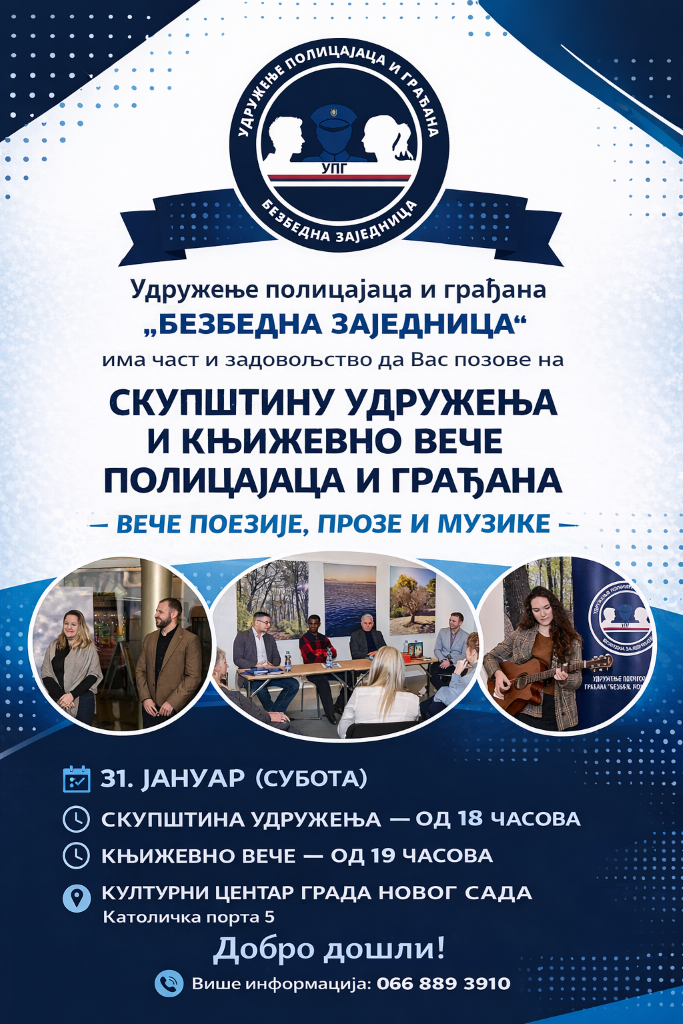 Удружење полицајаца и грађана „Безбедна заједница“ организује Скупштину Удружења и треће традиционално књижевно вече полицајаца и грађана, које ће бити одржано у суботу, 31. јануара, у Културном центру Града Новог Сада (Католичка порта 5).