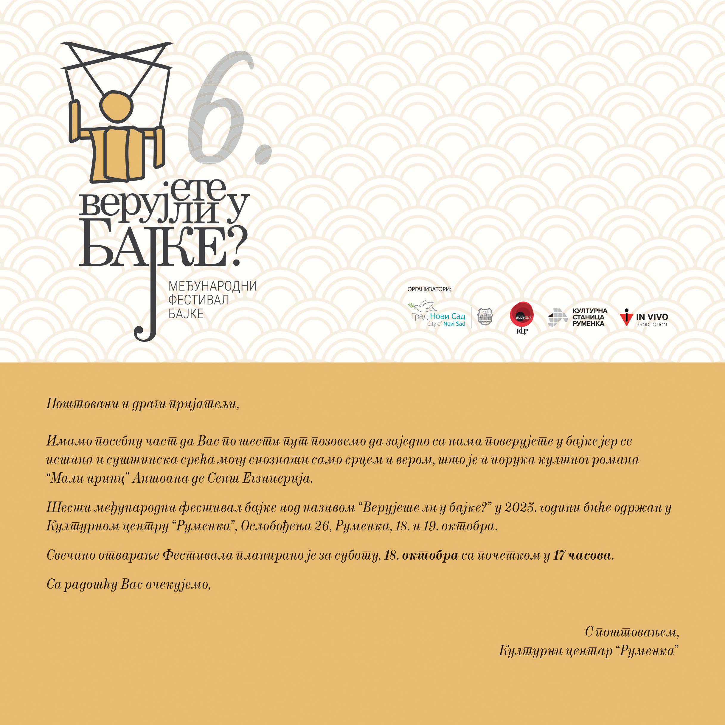 Фестивал бајке „Верујете ли у бајке?“ улази у своју шесту годину постојања и ове године биће посвећен обележавању 220 година од рођења и 150 година од смрти чувеног писца Ханса Кристијана Андерсена. Манифестација ће бити одржана 18. и 19. октобра 2025. године у Културном центру Руменка, а улаз је слободан.